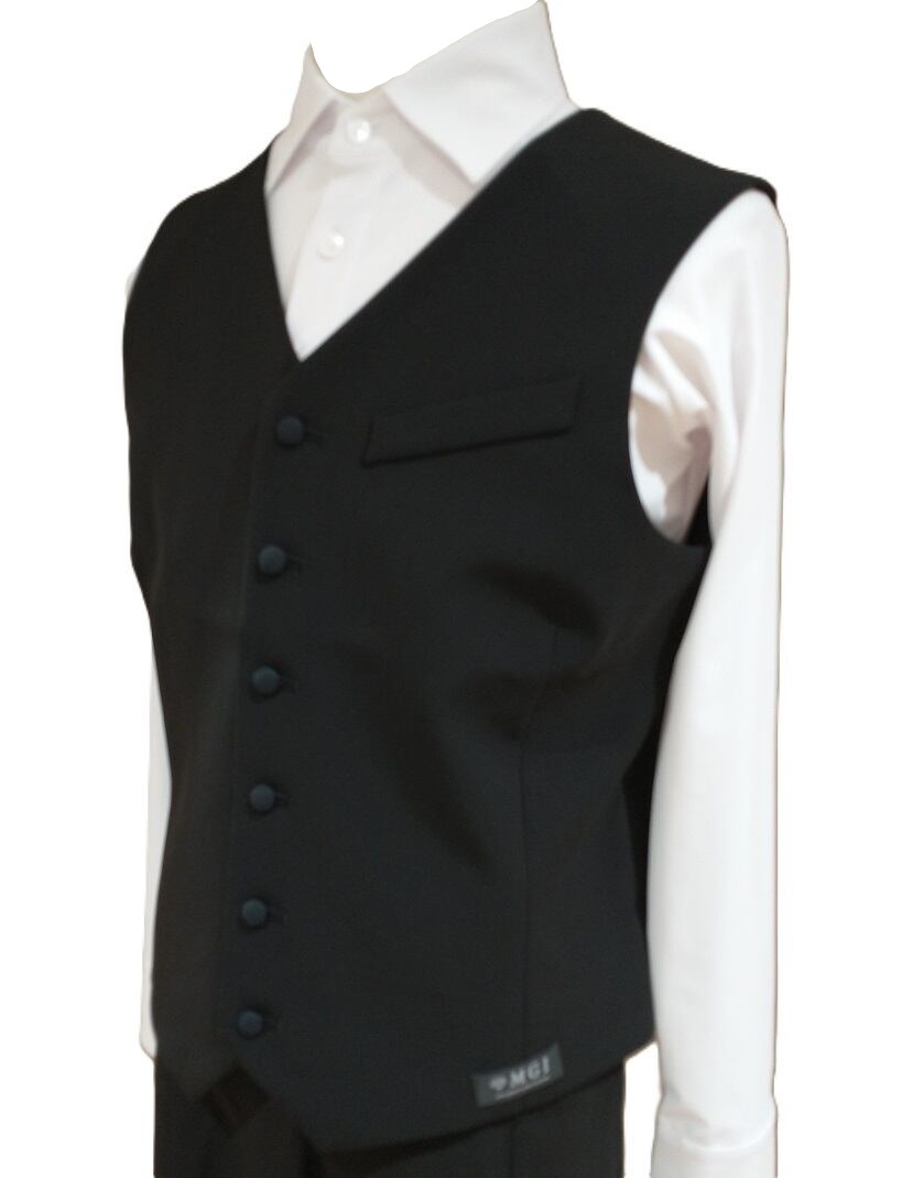 アトリエMGI オリジナルメンズベスト 定番の襟付きデザインです。 張りのある素材感と、6ッボタンのスマートなVゾーンです。 S 胸囲約98cm M 胸囲約102cm L 胸囲約106cm ≪カラー≫ブラック